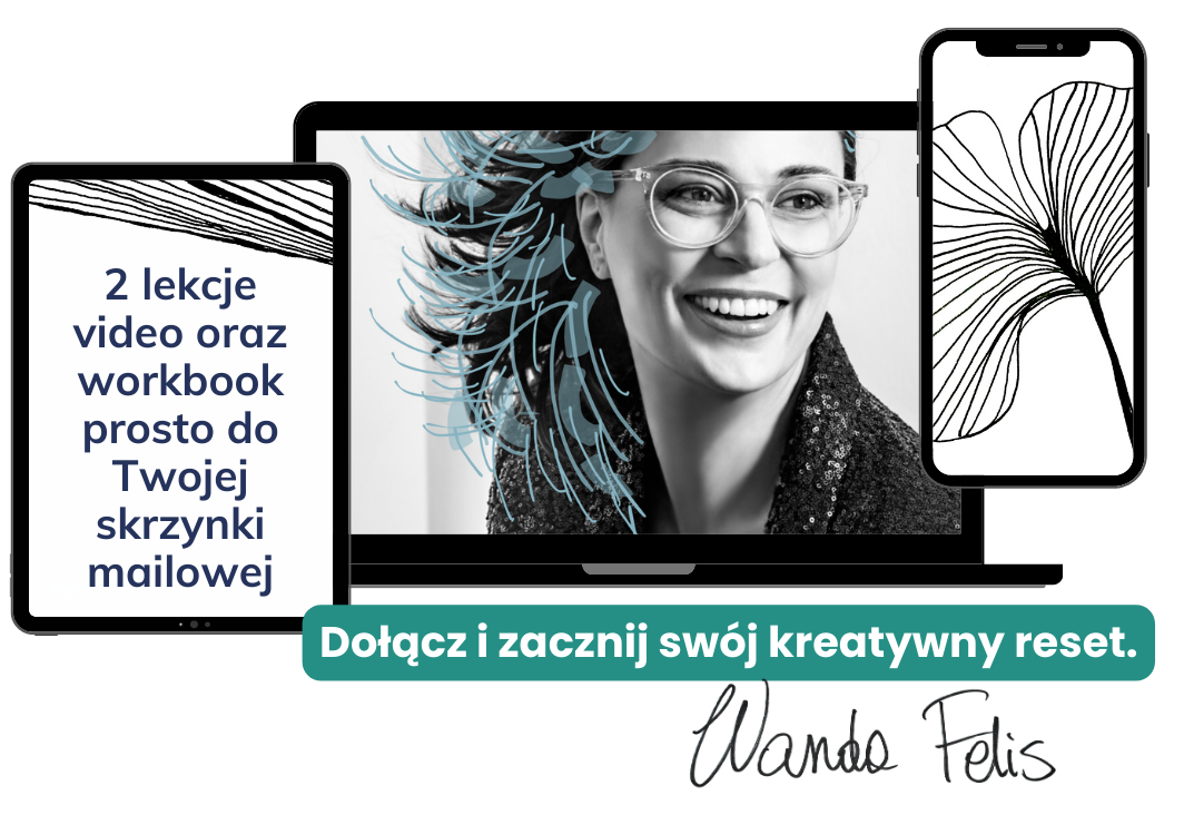 Nazywam się Wanda Felis i pokazuję, jak we własnym domu, przy biurku albo na ławce w parku przeskoczyć z trybu "alert" w stan spokojnego wyciszenia. Przekonasz się, jak za pomocą prostych narzędzi zatrzymać się na moment i oderwać od ekranów, zadań, goniących Cię terminów. Jak z łagodną ciekawością "spotkać własne myśli". Tak właśnie działa artfulness, czyli twórcza praktyka uważności.